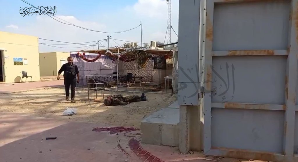 On the video, following clashes, it’s possible to see the corpses of various IDF soldiers and border guards lying bleeding dead on ground as the fighters advance into the central area of the Kibbutz