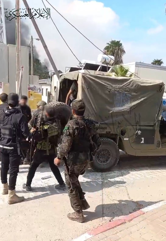 🇵🇸❌🇮🇱 — Via its official medias, the Al-Qassam Brigades (Hamas Military wing) published a footage showing the moments when its fighters raided and seized control over the Nahal Oz Kibbutz, a Jewish Settlement located 1 KM East of Gaza Tactical border