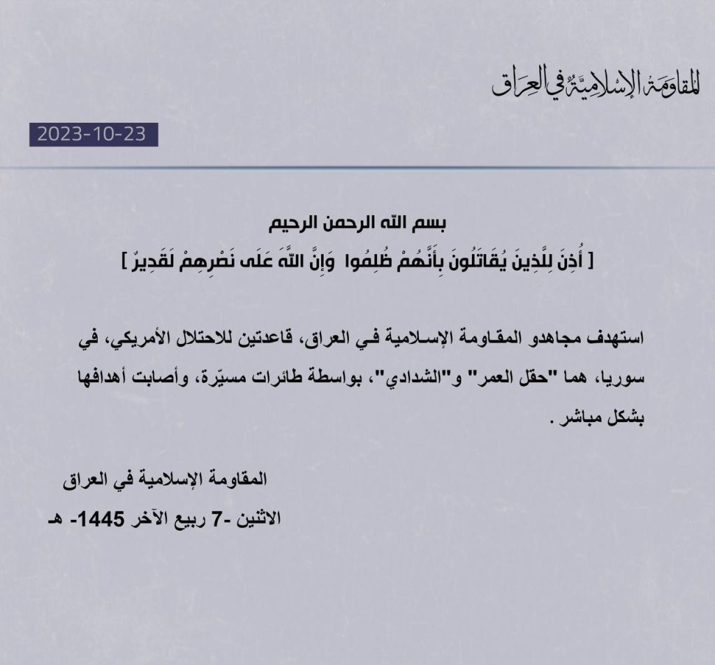 The Islamic Resistance in Iraq, Monday, Rabi` al-Akhir 7, 1445 AH