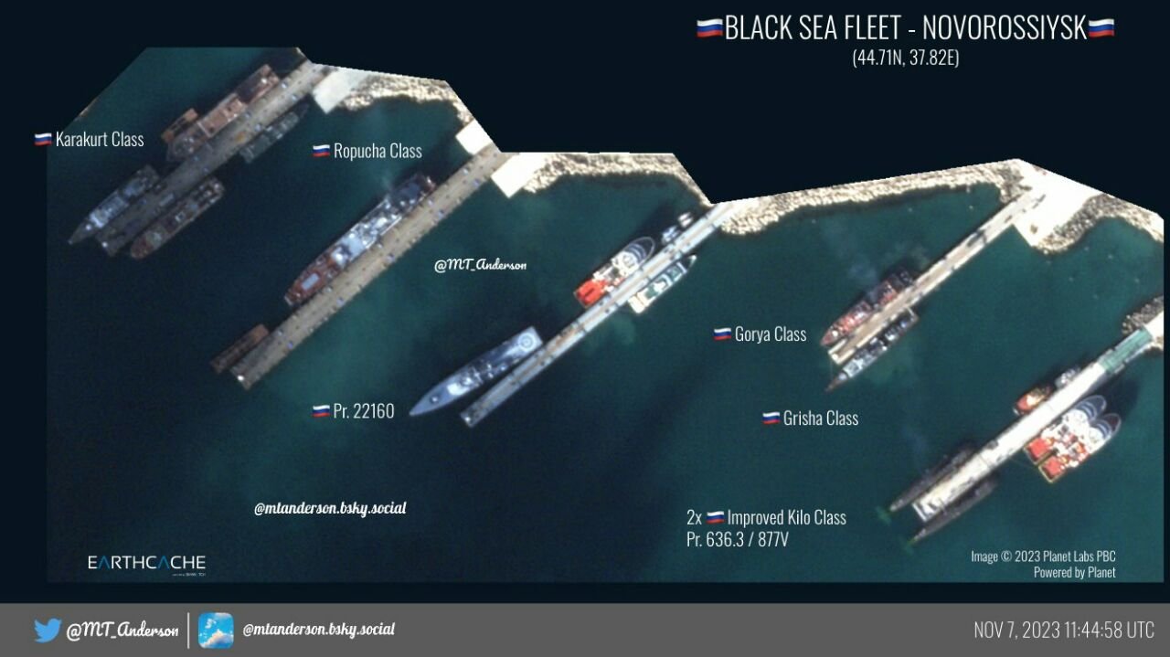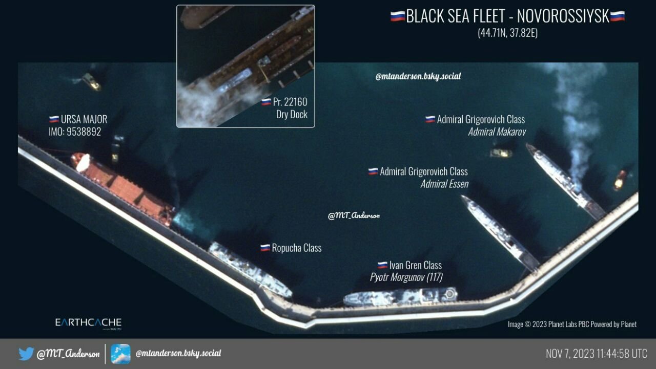 In comparison with the images for 02.11.2023, two PC 22160, three MRK 21631, two BDK 775 and one MT 266M/266ME/02668 left Novorossiysk, two OS 11982 returned to Novorossiysk.