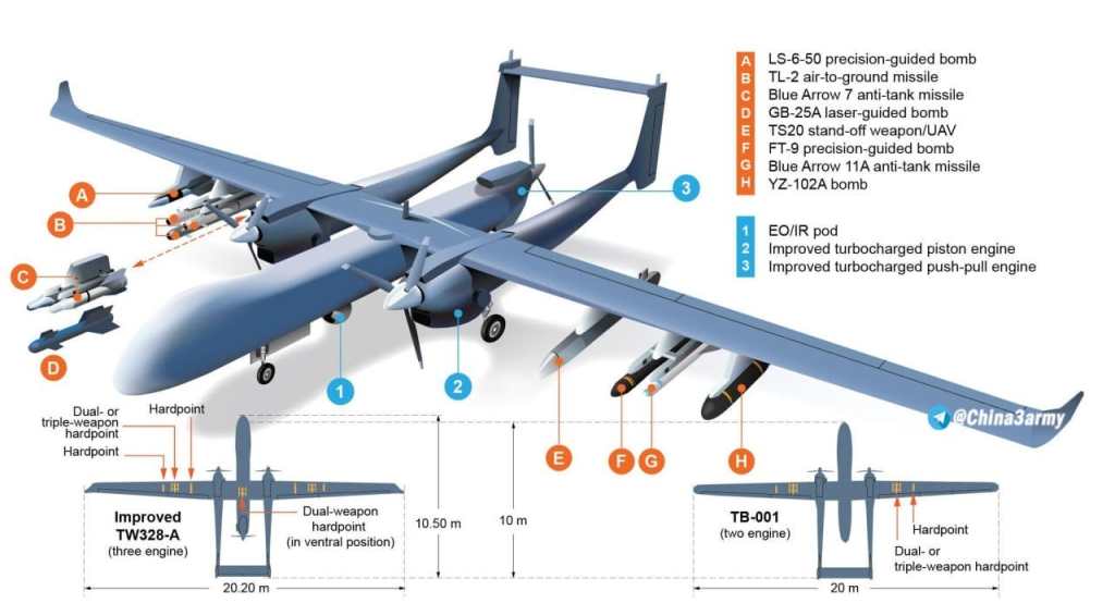 The TW328-A is a larger version of the Tengden TB-001 Scorpion UAV in service with the PLA.