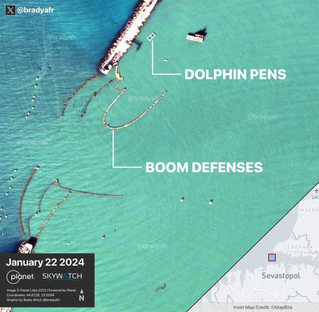 For the first time, reports of the Black Sea Fleet using specially trained dolphins to protect Crimea began to appear in the spring of 2022 and were then confirmed by satellite images throughout 2023, but after the November storm, the pens with dolphins disappeared for a while.