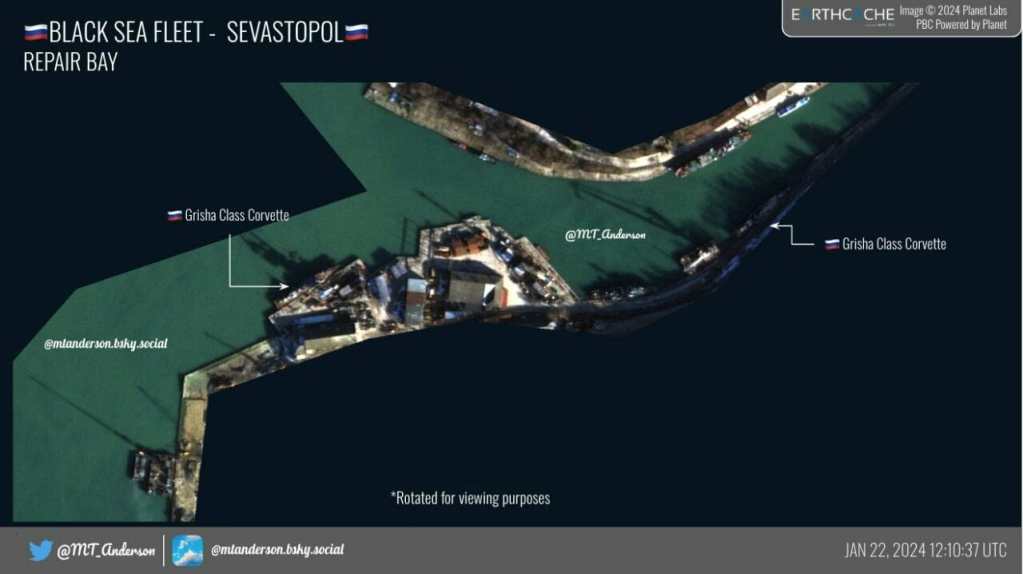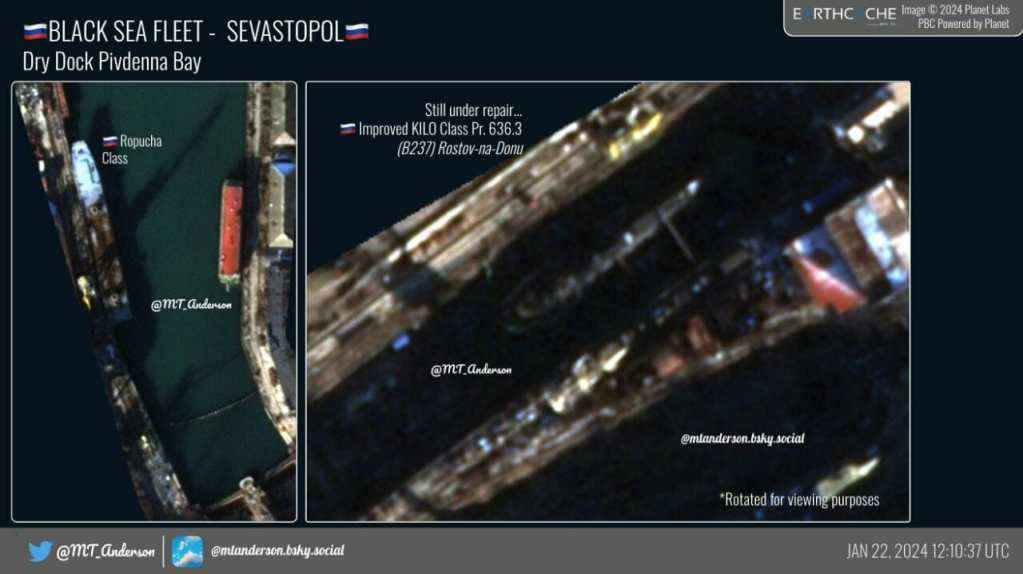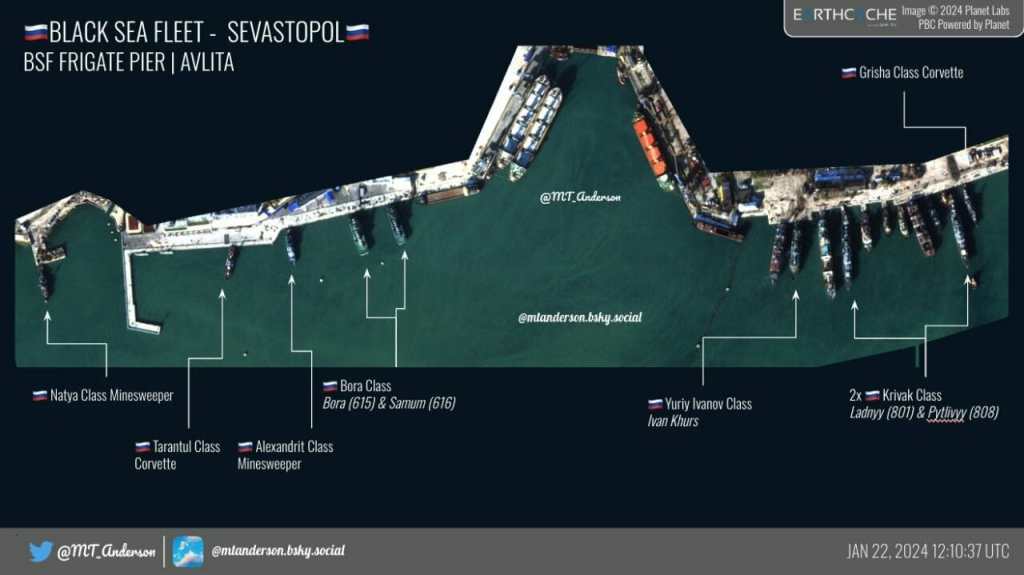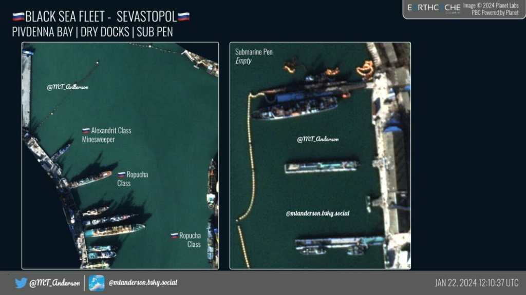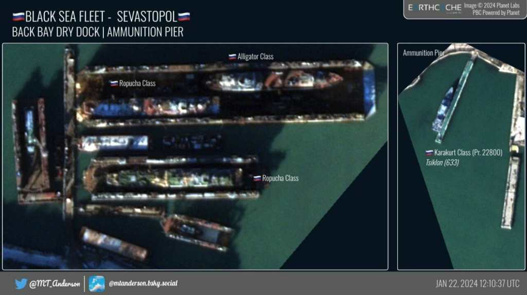 In comparison with the photographs for 01/15/2024, the Elbrus service station and the Spasatel Dmitry Gagin SBS (SB-36) left Sevastopol, the Kommuna SS, the Epron SS and the SPK 02690 arrived in Sevastopol.