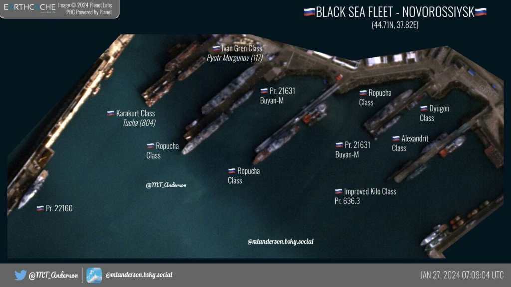 In comparison with the pictures for 01/23/2024, the Admiral Essen FR, Amur MRK (22800), Zheleznyakov MT and two MT 266M/266ME/02668 left Novorossiysk, PK 22160, MPK 1124M, MRK 21631 arrived in Novorossiysk, MT 12700, BDK “Orsk”, two BDK 775 and three universal dry cargo ships – “Baltic Leader”, “Lady Mariia” and “Ascalon”.