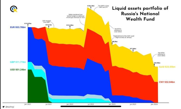 OSINT team Tochnyi estimates Russia’s liquid asset reserves at $55 billion. Almost all of them are Chinese yuan and gold.