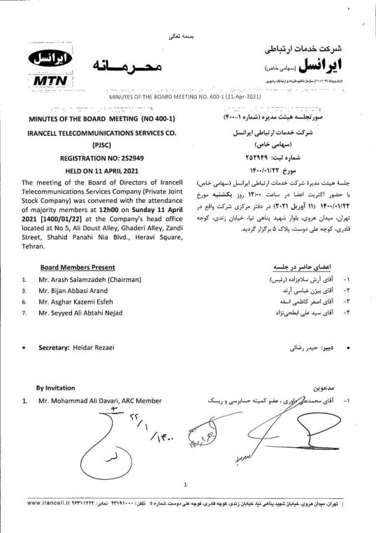 The meeting of the Board of Directors of Irancell Telecommunications Services Company (Private Joint Stock Company) was convened with the attendance of majority members at 12h00 on Sunday 11 April 2021 [1400/01/22] at the Company’s head office located at No 5, Ali Doust Alley, Ghaderi Alley, Zandi Street, Shahid Panahi Nia Blvd., Heravi Square, Tehran.
