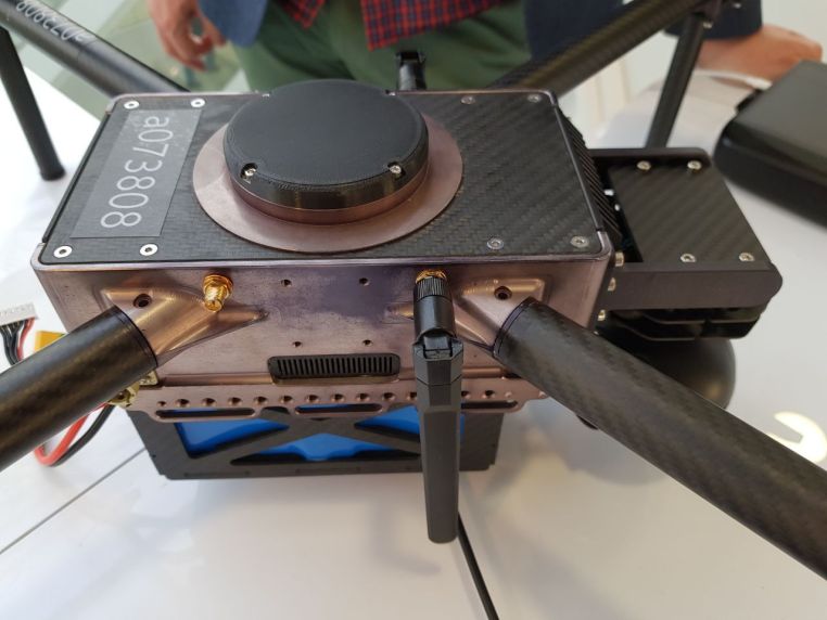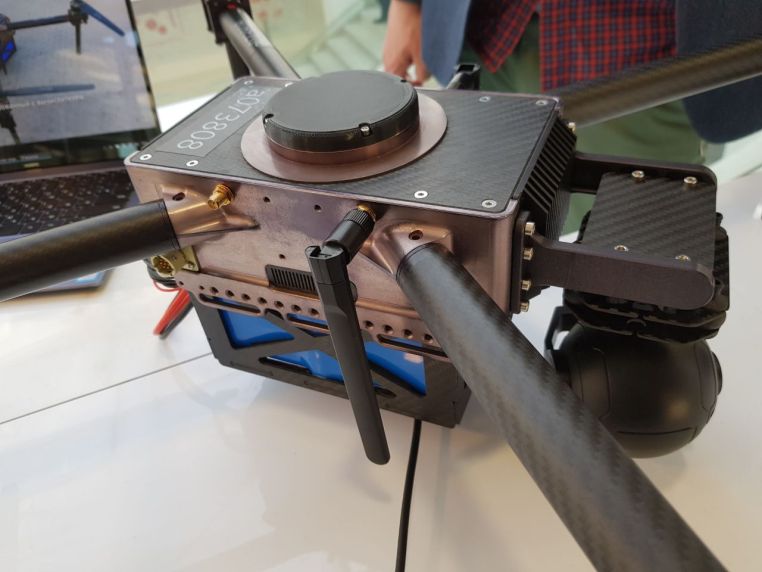Photo of the Aurora-1MT quadcopter with artificial intelligence at the opening of the public headquarters of the unmanned aerial vehicle industry, private space, and biotechnology.