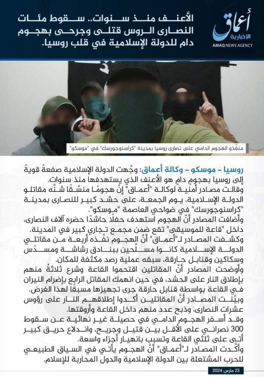 AMAK AGENCY HUNDREDS OF BUSINESS CHRISTIANS WERE KILLED AND INJURED AS A RESULT OF THE MOST VIOLENT ATTACK ORGANIZED BY THE ISLAMIC STATE IN THE HEART OF RUSSIA IN RECENT YEARS