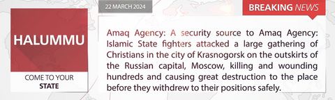 Security source for Amaq Agency: ISIS fighters attacked a large gathering of Christians in the city of Krasnogorsk on the outskirts of the Russian capital Moscow, killing and wounding hundreds of people and causing major destruction in the area before they retreated to their positions safely.