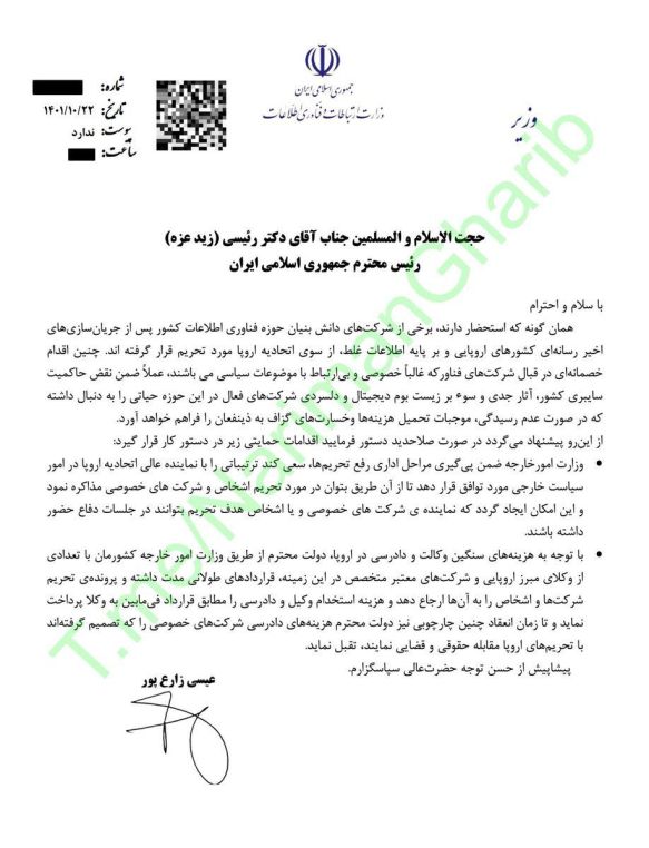 As mentioned, some of the country’s knowledge-based companies in the field of information technology have been sanctioned by the European Union after the recent media coverage of European countries and based on false information. Such a hostile action against technology companies, which are often private and unrelated to political issues, in fact, in addition to violating the country’s cyber sovereignty, has had serious and adverse effects on the digital ecosystem and discouragement of companies active in this vital field. It will impose exorbitant costs and damages on the beneficiaries. Therefore, it is suggested, if you have discretion, to order the following support measures to be included in the agenda. The Ministry of Foreign Affairs, while following up on the administrative procedures for the removal of sanctions, should try to agree on arrangements with the High Representative of the European Union in foreign policy affairs, so that through that, the sanctions on private individuals and companies can be negotiated and it will be possible for the representative of the companies Private persons or persons targeted by sanctions can attend defense meetings.