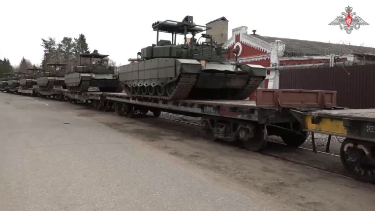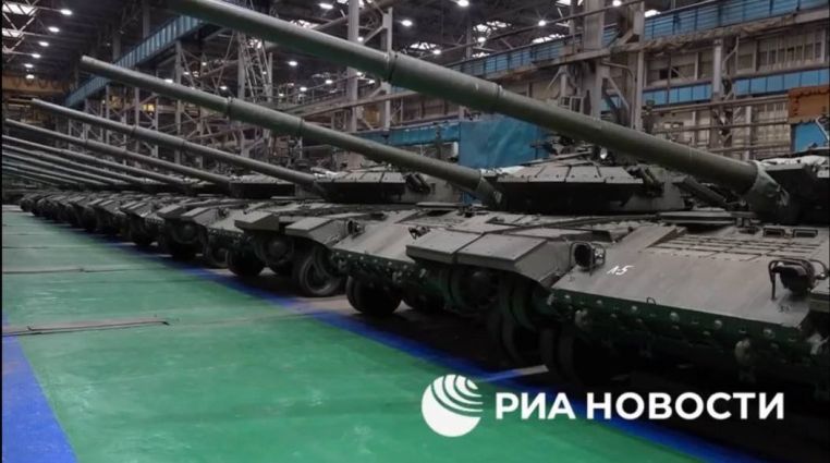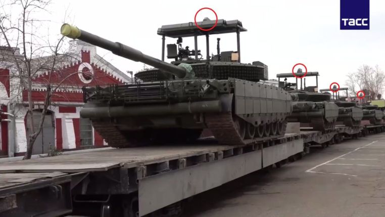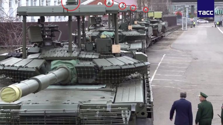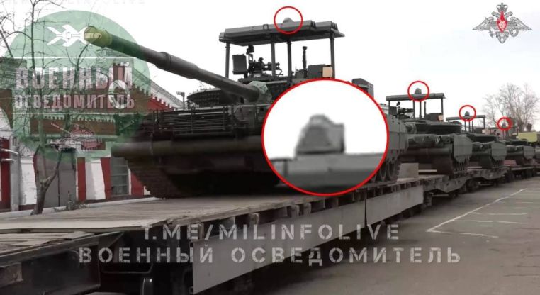 New Russian T-80BVM tanks with electronic warfare systems already installed on the roofs of barbecues.