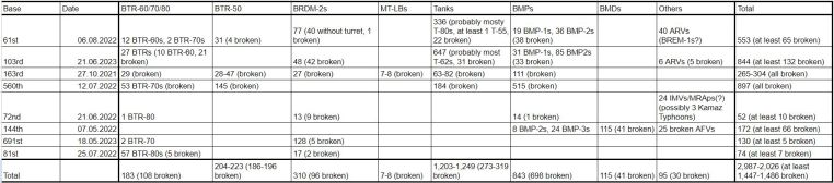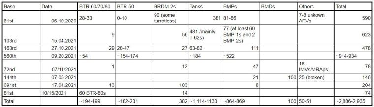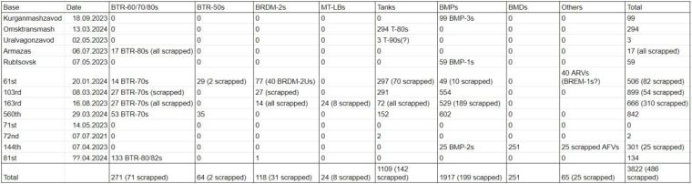 The number of other vehicles (BTR-50/60/70/80, BMD, BRDM, MT-LB and others) is relatively small. This is consistent with Jompy’s previously stated opinion that Russian stocks of almost all armored infantry vehicles except the BMP-1 have been exhausted.