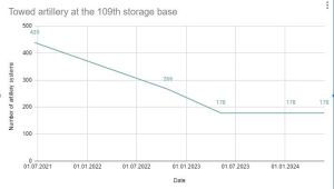 🗣 Since 2022, images of this storage base have been repeatedly updated and the researcher has compiled his own graph showing the decrease in artillery stocks. According to observations, since the beginning of the full-scale invasion, artillery pieces have been withdrawn at a rate of ~17.5 units per month, but since May 2023 no change has been observed.