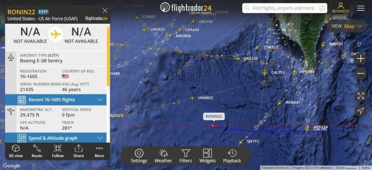 I would like to note that the United States is also not asleep. If American reconnaissance aircraft P-8A and RC-135 fly off the coast of Taiwan almost every day, today a rare guest was spotted, namely the US Air Force E-3B AWACS aircraft in the Bashi Strait (flight track on the screenshot).