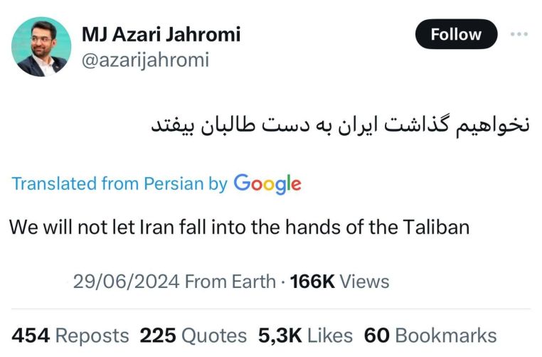 Mohammad Javad Azari Jahromi, Iran’s former Communications Minister during the Rouhani cabinet & current member of Pezeshkian’s campaign, wrote the following on Twitter: