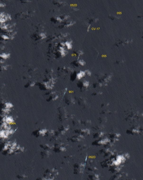 In the South China Sea, 83 km northeast of Woody/Yongxingdao Island (Paracel Islands), an eight-ship carrier strike group of the PLA Navy Southern Fleet was spotted