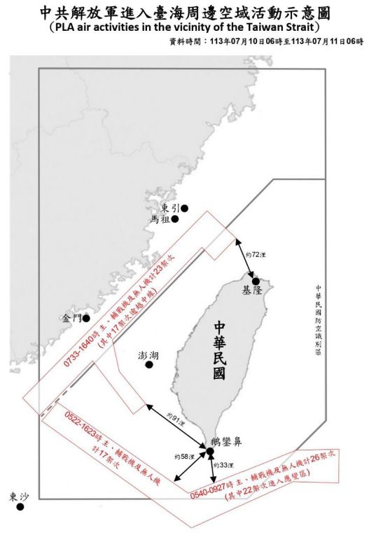 66 PLA aircraft and 7 PLAN vessels operating around Taiwan were detected up until 6 a.m. (UTC+8) today. 56 of the aircraft crossed the median line and entered Taiwan’s northern, southwestern and southeasten ADIZ.