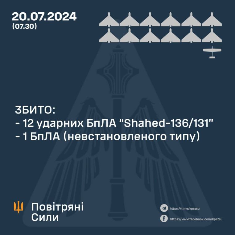 💥 As a result of the anti-aircraft battle, units of mobile fire groups of the Defense Forces of Ukraine, anti-aircraft missile forces and radio-electronic warfare of the Air Force shot down 13 air targets: