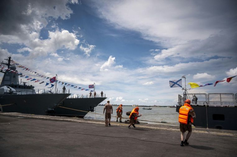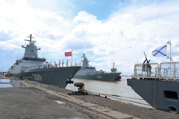 The corvettes Gromkiy (335), Geroy Rossiyskoy Federatsii Aldar Tsydenzhapov (339) and Rezkiy (343) of Project 20380 enter the port of Tanjung Perak in Surabaya, Indonesia, on November 3, 2024.
