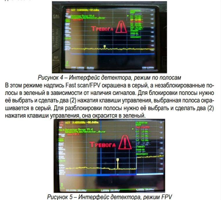 The standard interface of the detector has been supplemented with a signal presence notification, a list of scanned bands (the current scanned band is highlighted in yellow) and information on the presence (+ sign, the band is highlighted in red) or absence (- sign, the band is highlighted in green) of UAV signals, calibration modes (CALIBRATION), reset (RESET), increased sensitivity (SENSITIVITY), display shutdown (SLEEP), sound (SOUND), FPV and factory mode (STANDART). Movement through the bands and items is performed by pressing the control key left and right.