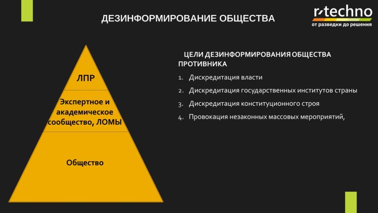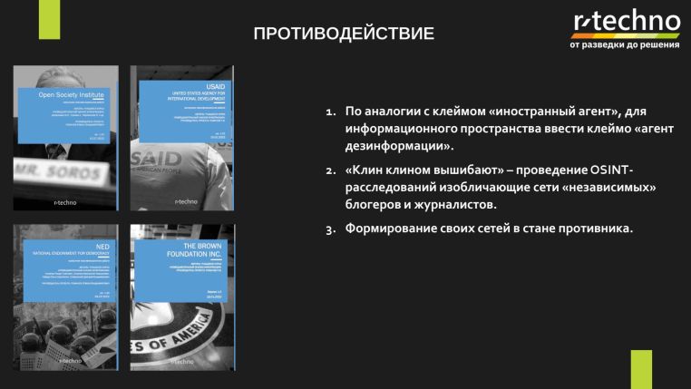 Countermeasures proposed in the presentation reveal a mix of defensive and offensive tactics. Labeling disinformation agents as “agents of influence” mirrors existing practices of branding organizations as foreign agents under Russian law. Conducting investigative efforts to expose adversarial networks reflects a commitment to turning opponents’ tools against them. Establishing networks within target nations demonstrates a proactive approach to infiltrating and disrupting adversaries from within. The measures define the cyclical nature of information confrontation, where tactics and strategies often mirror those of the opponent.