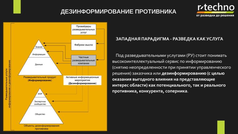 The first slide establishes the framework for understanding intelligence operations as a dual-pronged effort. On one side lies the goal of reducing uncertainty for decision-makers, allowing for more informed strategic choices. On the other side, disinformation targets opponents by shaping perceptions and decisions to an advantage. Romachev grounds this concept in a “Western paradigm,” arguing that intelligence and manipulation are two sides of the same coin. His rhetorical positioning preempts criticism of Russia’s disinformation activities by asserting that similar tactics have long been embraced by adversaries. The assertion of equivalency frames the discussion in a way that minimizes ethical scrutiny.