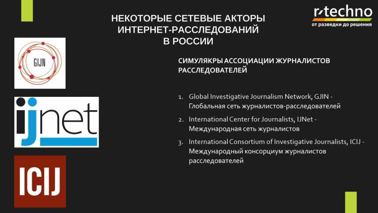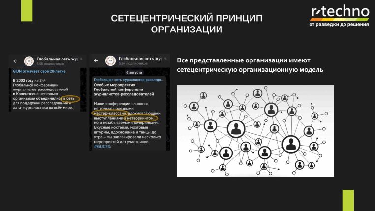 The discussion extends to actors involved in OSINT within Russia and internationally. The presentation casts suspicion on global journalism organizations, labeling them as potential fronts for adversarial activity, likely since this is a standard of zrussian globall disinformation. His mischaracterization is dual purpose: discrediting legitimate investigative efforts while positioning Russian operations as necessary countermeasures. The reference to network-centric organizational models indicates an aspiration to emulate the decentralized and adaptive structures of these groups. The adoption of these principles shows an acknowledgment of their efficacy in contemporary operations.