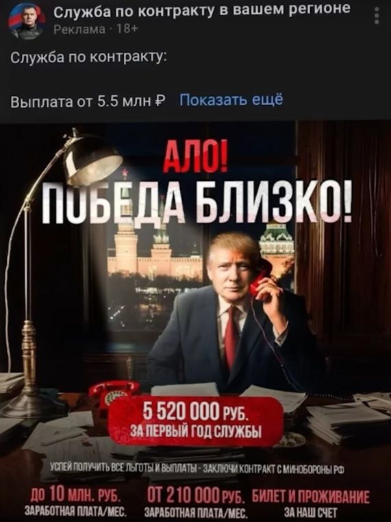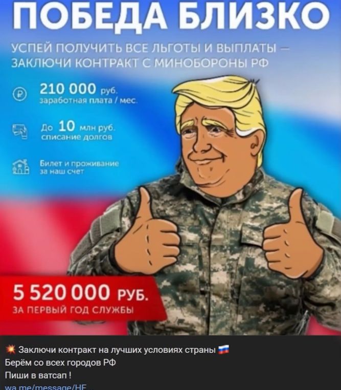 The 1st image is a caricatured attempt at military recruitment, featuring a grotesquely drawn trump in Russian fatigues, giving a thumbs-up as if he were a used car salesman peddling a suicide mission. Their absurd monetary incentives, including a monthly salary of 210,000 rubles (a bait for the destitute), debt forgiveness of up to 10 million rubles (a lie that preys on Russia’s widespread economic misery), and free transport and housing (a euphemism for mass relocation to the frontlines to die for oligarchic ambition). The ultimate lure is a total of 5.52M rubles for the first year of service equates to the price of one’s life being auctioned off to the Putin’s war machine.
