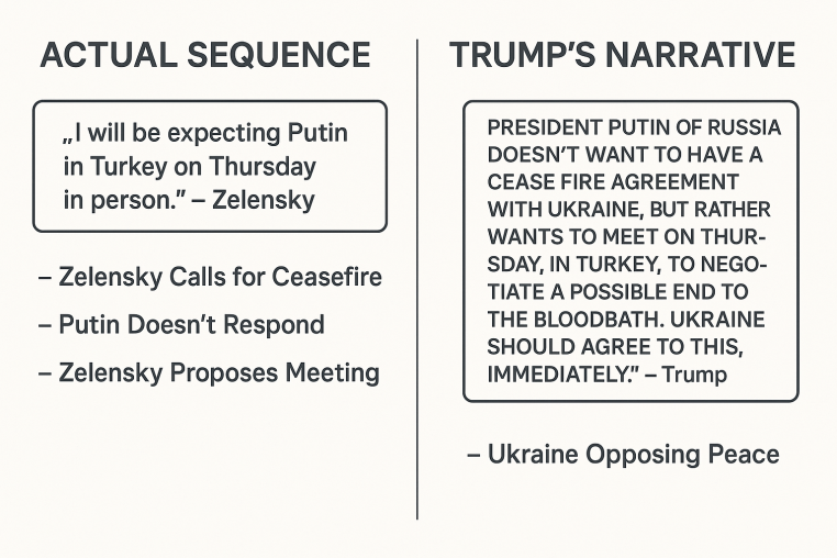 Trump’s post reads like an accidental confession of disinformation laundering and egotistical buffoonery that undermines U.S. foreign policy, embarrasses Ukraine, and exposes Putin. The statement accepts Kremlin propaganda as fact, misrepresents the diplomatic sequence, and reveals a stunning ignorance of the tactical setup already in motion. Trump echoes a fictitious Russian narrative: that Putin, not Zelensky, proposed the Turkey meeting—when in reality, Putin ignored a Ukrainian ceasefire offer and Zelensky flipped the table by daring him to show up. Trump either didn’t check or didn’t care, blindly parroting the Kremlin’s inversion of events.