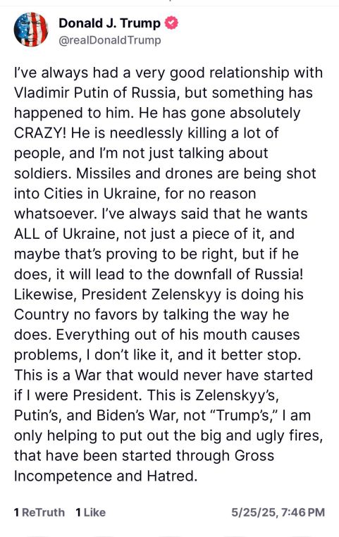 Then comes the narcissistic pivot: “This is Zelenskyy’s, Putin’s, and Biden’s war, not Trump’s.” This is a textbook display of ego-protective projection. By invoking everyone else’s name—Zelenskyy, Putin, Biden—he distances himself from the consequences of his own rhetoric and policy legacies, which helped embolden Russia and fracture U.S. alliances. In doing so, he attempts to recast himself not as a former head of state with immense responsibility, but as some prophetic bystander heroically trying to douse the flames. This is delusional self-mythologizing in full bloom.