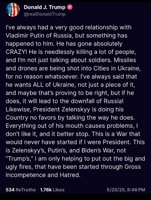 trump then bizarrely pivots to reinforce his own prophecy by stating that he “always said” putin wanted all of Ukraine, a self-serving nod to his own supposed foresight. But rather than offering this insight as a warning, he spins it into a smug verification of his own genius. He claims that this ambition will lead to Russia’s downfall, a prediction offered without evidence and contradicted by his own earlier praise of Putin’s strength and savvy. It reeks of retroactive moral posturing—a cynical way to insulate himself from accountability for his years of Kremlin appeasement.