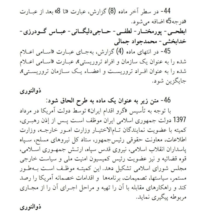 Diplomatically, several articles focus on undermining the U.S. move and shoring up support for the IRGC. The Iranian government is mandated to use all legal, political, and diplomatic channels to nullify the U.S. designation of the IRGC, for instance by lodging formal protests in international forums and rallying other states to disregard or oppose the U.S. policy. Iran’s foreign ministry must engage in bilateral and multilateral diplomacy to protect the IRGC’s legitimacy as an official armed force and to “minimize the benefit” that U.S. forces can gain from bases and support in regional countries. In practice, this hinted at pressuring neighboring countries not to cooperate with U.S. military plans against Iran. An earlier draft of the plan even proposed banning the entry of U.S. Navy vessels into Iranian waters of the Persian Gulf unless subjected to Iranian inspection, and formally labeling the U.S. Army, CIA, and Israel’s Mossad as terrorist organizations. (These more extreme provisions were part of an initial “triple-urgency” proposal and did not appear in the final law, which took a somewhat narrower focus.)