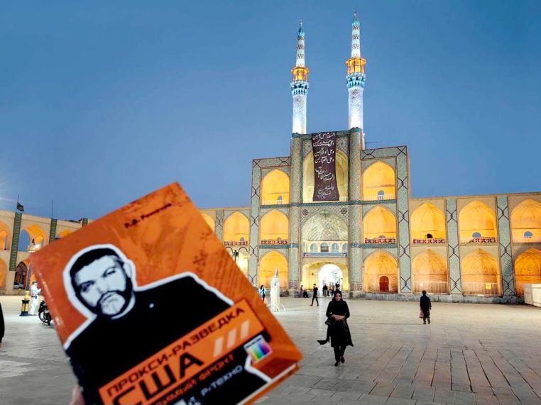 The image is a masterclass in state-sponsored disinformation theater, featuring a Russian-language propaganda book clutched triumphantly in front of Iran’s iconic Amir Chakhmaq Complex in Yazd. The visual screams self-congratulatory arrogance, perfectly capturing the spirit of Moscow’s newest intelligence cosplay campaign. The book itself, dripping in loud hues of red and orange like a bad Soviet poster reprint, features a brooding romachev trying to hawk his book while looking like a rejected Spetsnaz influencer who took one online OSINT course and now fancies himself the next Lavrentiy Beria with Wi-Fi.