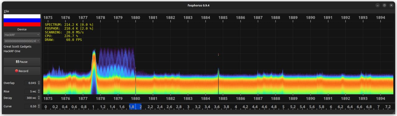 Furthermore, fosphorus 0.9.5 enhances operational utility with additional features. These include bandwidth measurement by dragging the mouse cursor and the ability to switch SDR sampling frequencies (e.g., for HackRF, 20 MHz, 10 MHz, and 5 MHz) for “zooming” the signal band, providing greater flexibility in analyzing specific frequency ranges.