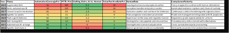 Agentic AI will not erase the need for security outcomes. Agentic AI will significantly alter the current work pattern that incident responders and SOC operators perform. Pressure for speed, coverage, and cost drives the shift. Autonomy that perceives, reasons, and acts on threats at machine speed changes the center of gravity from manual triage toward continuous machine decision-making with human governance. A durable forecast requires structured reasoning, not hype. The following model integrates threat dynamics, enterprise constraints, regulatory demands, and learning system behavior across time.
