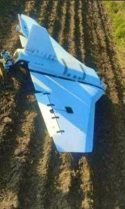 Damage photos show crushed roofing and shattered masonry near a parked car, with no scorching, spall, or fragmentation spray. Observed effects match an unarmed glide or motor-off crash at shallow angle. That pattern comports with decoy or relay roles where payload mass remains wiring, batteries, and antennae rather than an explosive body.