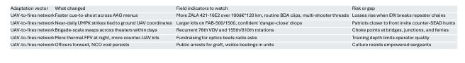 Russian forces learned to see farther, shoot faster, and move quicker by rail. Observation UAVs now stitch fires, EW, and glide bombs into a single kill chain that reaches deep into rear areas. Artillery doctrine shifted from volume to verification—find, strike, assess, and strike again. Leadership and logistics still drag. Lack of NCOs bleeds initiative; corruption bleeds supply; over-centralization bleeds time. Messaging hides cost through the “learning” story while selective footage proves effect. Future combat will feature thicker UAV layers, brisker joint tasking, persistent night action, and repeated rail shuffles. Gaps stay open—small-unit leadership, ethical rot, transport limits. Opponents who break the UAV constellations, scramble patterns, and stress rails will slow the learning curve and reopen operational space.