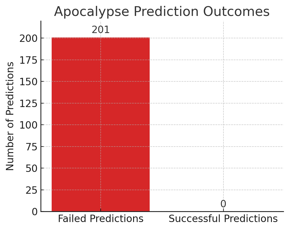 It is statistically remarkable (and a touch darkly comical) that apocalyptic prophets have been wrong 201 out of 201 times. The score- World – 201, Doomsayers – 0. In sports terms, the prophets’ batting average is .000 – complete failure. The Doomsday Scoreboard’s tally shows “201 Failed Apocalypse Predictions So Far – 0 Successful”. The perfect failure rate is visualized in Figure 1 above, where the bar for failed predictions towers at 201, and the success bar is literally zero. In a field that claims divine revelation or secret knowledge of destiny, a zero-percent accuracy record is damning. By comparison, random guessing or flipping a coin would theoretically yield a better success rate if the end of the world were even remotely imminent over such a long period – but no one has ever guessed correctly, not even by accident.
