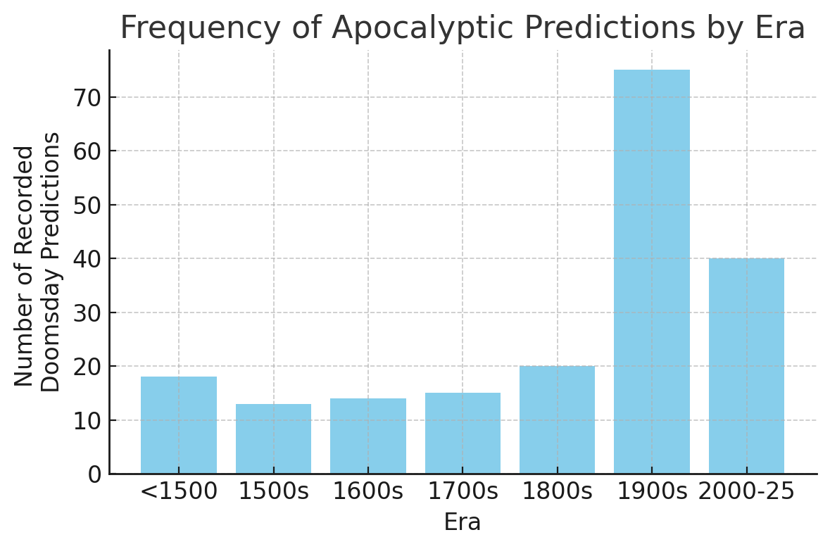 Figure 2- Frequency of recorded doomsday predictions by era. Prophecies of the apocalypse have proliferated in modern times (20th–21st centuries) compared to earlier periods, despite a consistent lack of fulfillment.