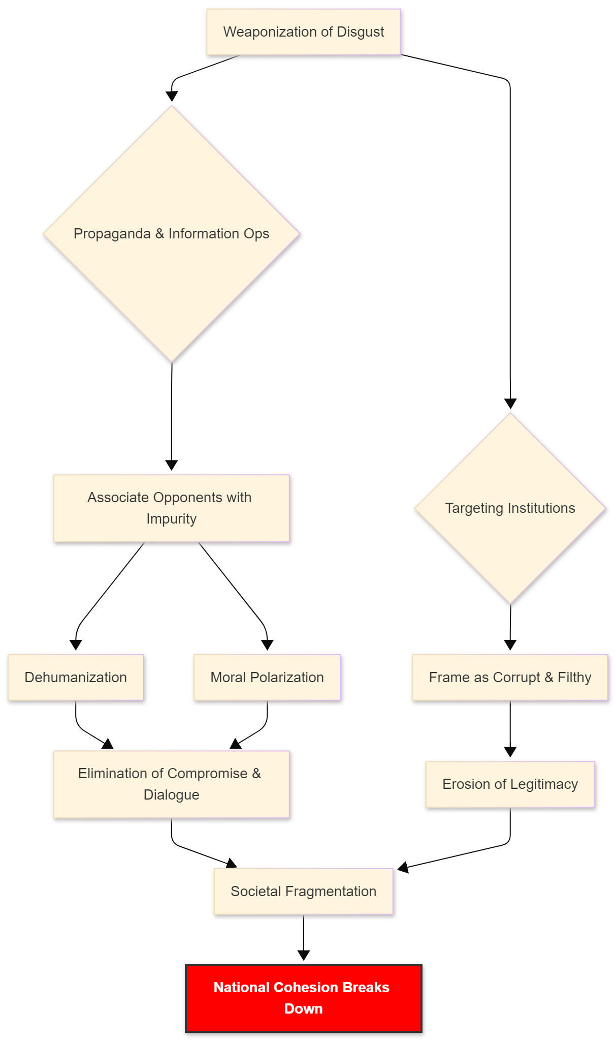 The following chart illustrates the pathway from the weaponization of disgust to the breakdown of national cohesion.