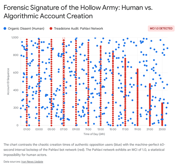 The Metronome Coherence Index (MCI) measures the timing consistency of account creation and engagement. A score of 0.0 represents chaos or human behavior, while 1.0 represents perfect machine synchronization. The audit of 356,941 Pahlavi-aligned accounts returned an MCI of 1.0.1. These accounts were created at exact sixty-second intervals and formed a “perfect grid” of digital infantry. The system generated streaks of over 1,200 consecutive accounts on peak operation days in June 2025 without a single deviation from the sixty-second rhythm.1 Such precision is impossible for human operators and indicates the use of high-latency botnets designed to overwhelm social media algorithms.