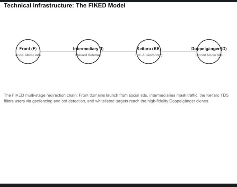 The technical architecture behind Operation Doppelgänger is designed to achieve three main goals: bypassing content moderation, geofencing the target audience, and tracking campaign effectiveness. Central to this is the FIKED model, a four-stage redirection chain that masks the true nature of the operation from platform moderators and international researchers.