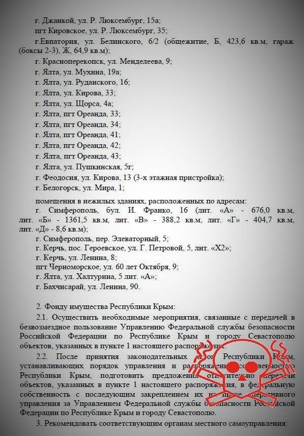 Our group “Where is the Fire” offers new goals MAXIMUM REPOST 1) Airfield of Yevpatoriya Aircraft Repair Plant45.22008, 33.38033 2) HF in Feodosia45.0603641, 35.3802054 3) Oktyabrskoye Air Base45.31652, 34.09564 4) Government of the city of Sevastopol 4.61518875582104, 33.5249554575455 5) Department of the FSB, Simferopol 44.957073, 34.102689 6) Russian Guard, Simferopol 44.940790, 34.092919